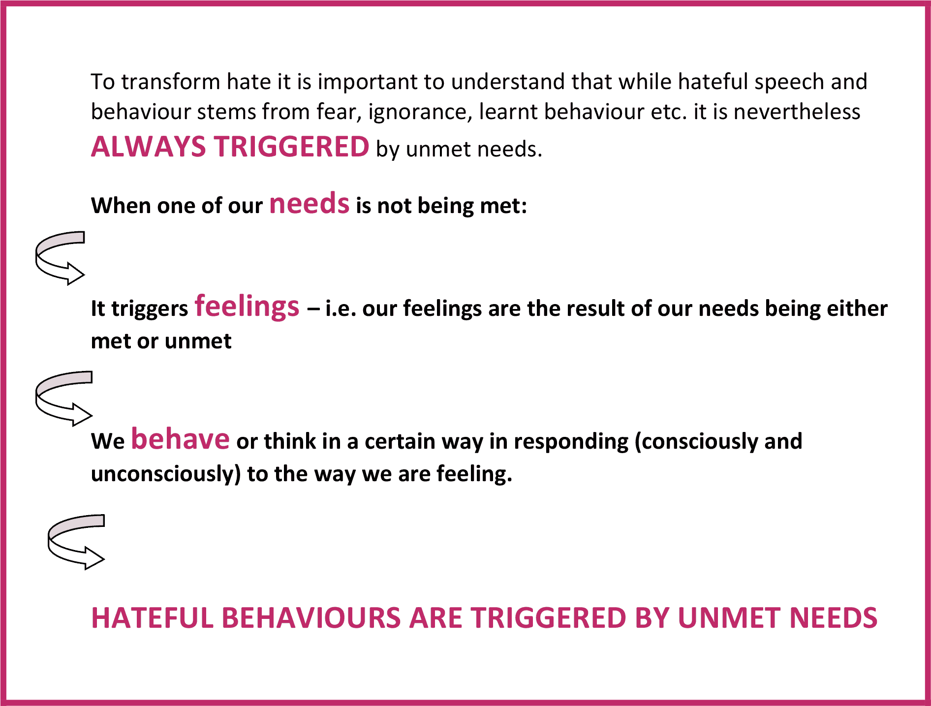 When in any situation in which hateful behaviour or language happens and that requires transformation remember: • Where are you at? (Your self-awareness). • What is actually happening? (observing). • What are the feelings you can observe? (yours and the others). • What are the needs that might not be met? • What is your intention in this situation? • What do you want to achieve? • Identify the ask you are going to make. |