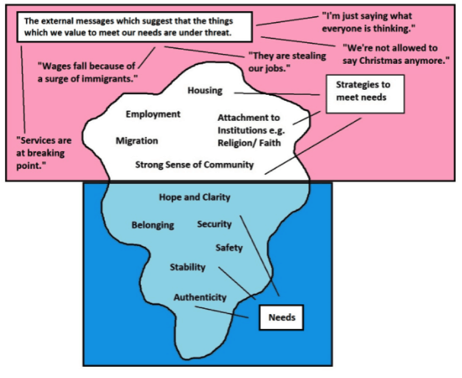 - Externally we all receive messages which suggest that the things which we value to meet our needs are under threat and these can come in the form of newspaper or Facebook feeds such as ‘wages fall because of surge of immigrants’; ‘we’re not allowed to say Christmas anymore’; ‘I’m just saying what everyone is thinking’ (which really connects to authenticity and clarity as right wing views are often expressed as authentic and non-hypocritical.